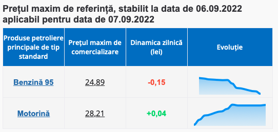 Așadar, mâine, 7 septembrie, benzina se va ieftini cu 15 bani și va ajunge să coste cel mult 24.89 lei per litru, în timp ce motorina mai adaugă 4 bani la preț și se va comercializa nu mai scump de 28.21 lei per litru.