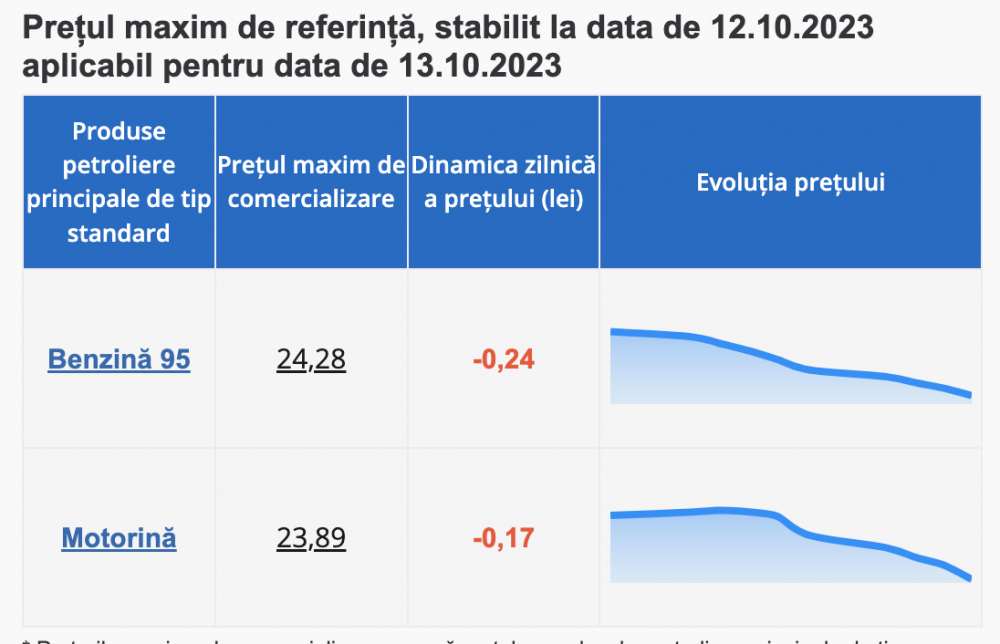 Un litru de benzină va fi comercializat cu prețul de 24.28 lei, atestând o scădere cu 24 de bani. Motorina, la rândul ei, înregistrează o scădere cu 17 bani și se va vinde la pompă cu prețul maxim de 23.89 lei.