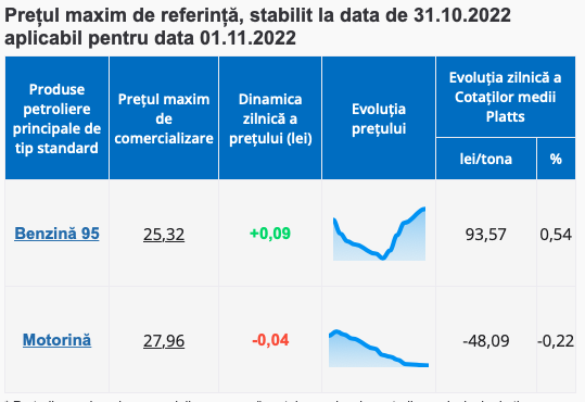 Astfel, benzina adaugă la cost 9 bani și ajunge să se comercializeze cu cel mult 25.32 lei per litru, în timp ce motorina se ieftinește cu 4 bani și se va vinde la pompă nu mai scump de 27.96 lei per litru!
