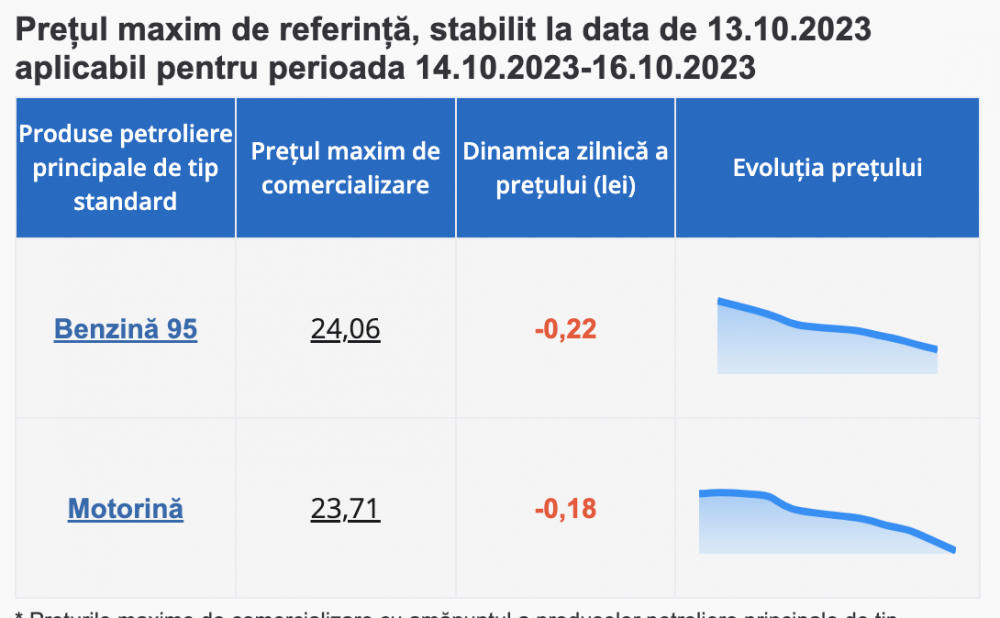 În aceste condiții, prețul benzinei scade cu 22 de bani și constituie 24.06 lei. Iar motorina reușește să scadă sub 24 de lei, după o scădere cu 18 bani și are prețul final de 23.71 lei.