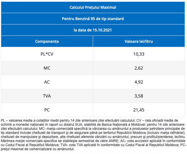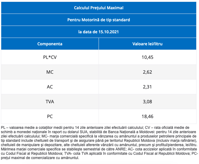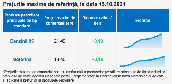 Astfel, pentru benzina standard A 95 șoferii vor achita pânăa la 21.45 lei per litru, cu 13 bani mai mult. Pentru motorină, costul maxim stabilit este de 18.46 lei per litru, adică cu 16 bani mai mult.