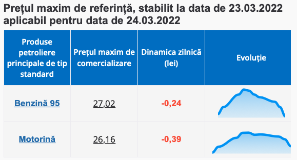 Astfel, pentru mâine 24 martie, ANRE anunță o ieftinire a benzinei cu 24 de bani, care se va comercializa cu maxim 27.02 lei. În același timp, motorina scade din preț tocmai 39 de bani și se va găsi la stațiile PECO cu un preț nu mai mare de 26.16 lei.