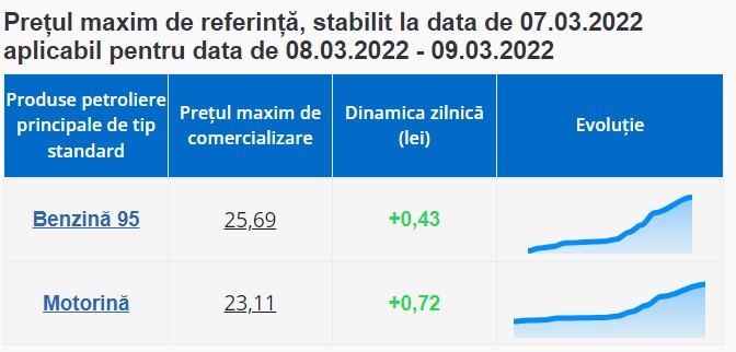 Astăzi ANRE a stabilit noi prețuri plafon pentru următoarele două zile, 8 și 9 martie. Astfel, un litru de benzină A95 va fi comercializat cu 25.69 lei, înregistrând o creștere cu 43 de bani. Între timp, motorina pășește pragul de 23 lei și ajunge să coste 23.11 lei, adăugând 72 de bani la preț!