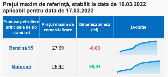 Astăzi, ANRE publică noile prețuri plafon pentru mâine 17 martie, care indică prima ieftinire a benzinei din acest an, tradițional una nesemnificativă. Așadar, mâine prețul benzinei scade cu 3 bani și ajunge să fie de maxim 27.69 lei, în timp ce motorina mai adaugă 1 ban la costul său și se va comercializa cu maxim 26.92 lei.