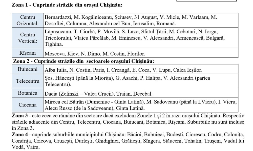 În Zona 1, un abonament de 7 zile, care include sectoarele Centru și Râșcani, ar putea costa 560 de lei. Dacă ai nevoie de un abonament de 30 de zile, vei achita 2.400 de lei, pentru 90 de zile – 7.200 de lei, iar pentru 180 de zile – 14.400 de lei. Cel mai costisitor abonament este cel pentru un an de zile, care ar putea costa, în aceste zone, 28.800 de lei. Tariful pentru o oră, propus de Primăria Chișinău, este de 20 de lei.