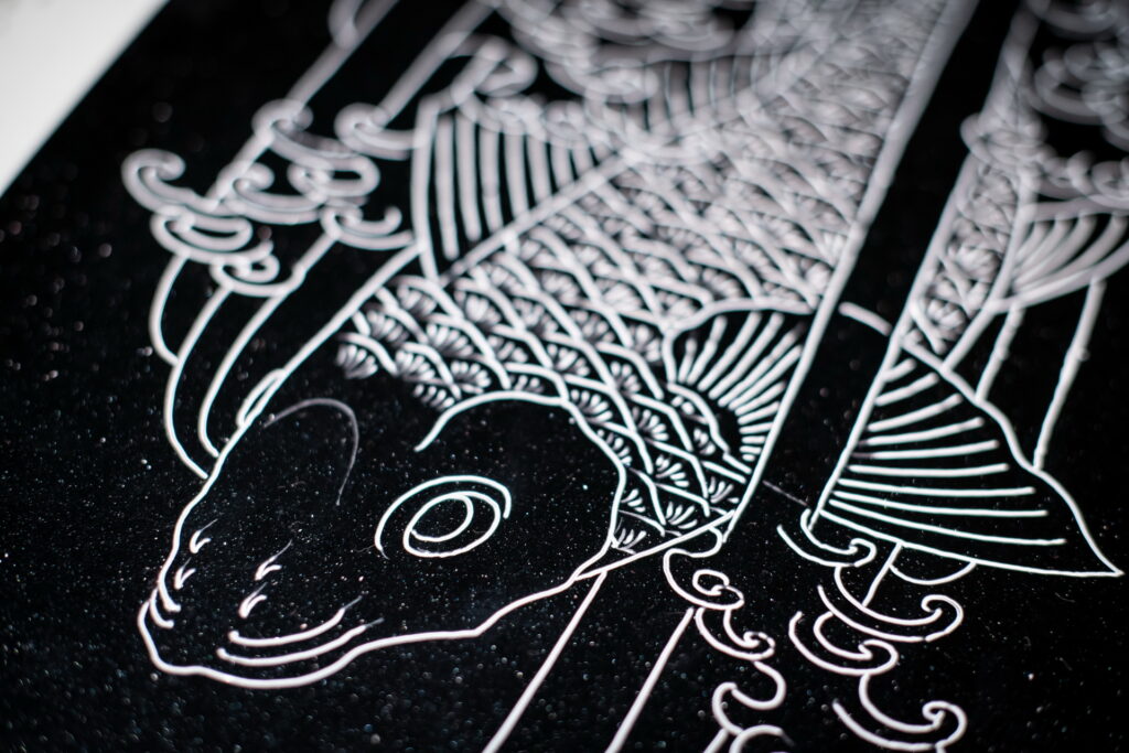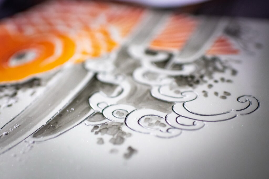 Pe alocuri, pentru un efect 3D a fost aplicată și folie de aur, iar peste desenul finisat a fost aplicat un strat de lac protectiv, sub care însă, se pot vedea adânciturile făcute cu Dremel-ul și tabla lucioasă.