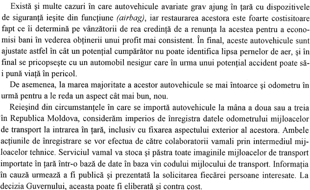 Reieșind din circumstanțele în care se importă autovehicule la mâna a doua în Republica Moldova, considerăm imperios de a înregistra datele odometrului mijloacelor de transport la intrarea în țară, inclusiv cu fixarea aspectului exterior al acestora.