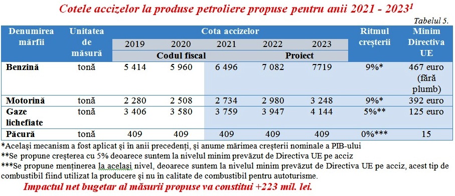 benzină – de la 5.960 lei în 2020, la 6.496 lei pentru o tonă în 2021 și la motorină – de la 2.508 lei la 2.734 lei, iar gazul lichefiat 5%: de la 3.580 lei la 3.759 lei.