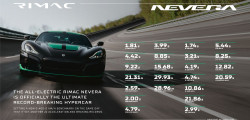 Noul supercar de la Rimac pare a fi unul dintre cele mai rapide modele de serie produse vreodată. Supercarul este propulsat de 4 motoare electrice, care însumează 1.900 CP. Anul precedent, modelul a stabilit recordul oficial pentru cea mai mare viteză atinsă de o mașină electrică de serie, după ce Nevera a reușit să atingă 412 km/h.