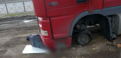 Un caz șocant a fost înregistrat pe un traseu din Rusia! Șoferul unui TIR a fost strivit de propriul vehicul în timp ce-i schimba roata din față.