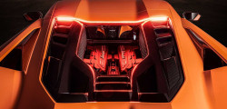 Nu mai este o noutate că sub caroseria "taurului" se ascunde un șasiu din fibră de carbon. Astfel, masa proprie a automobilului constituie doar 1.772 de kilograme. Iar pe interior, Lamborghini a pregătit un instrumentar de bord digital, cu ecran de 12.3 inch, display central de 8.4 inch și un ecran de 9.1 inch pentru pasagerul din dreapta, destul de generos, nu?