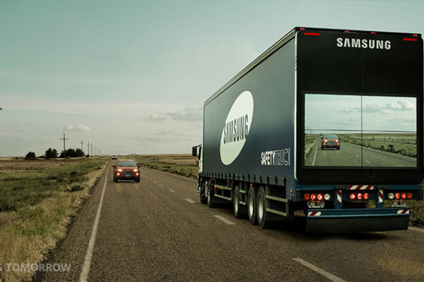 Samsung, gigantul tehnicii casnice a venit cu o soluţie în ajutorul şoferilor angajaţi în depăşirea unui autotren. Cum? Cu ajutorul unui display enorm care îţi arată tot ce nu poţi vedea tu în faţa camionului!