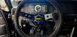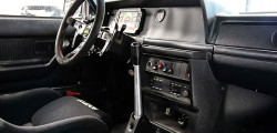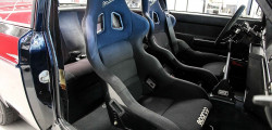 Scaunele față sunt Sparco Pro2000 uzate, dar funcționale, cu centură de siguranță cu trei puncte. Panoul de bord Haltech IC-7 furnizează toate informațiile necesare, alături de un indicator VDO pentru nivelul de combustibil. Mașina nu are frână de mână, având doar un buton pentru modul de parcare al cutiei de viteze.