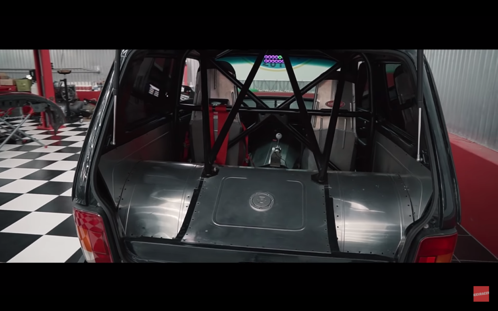 Exteriorul mașinii este trădat doar de jantele cromate încălțate în anvelope speciale pentru cursele de Drag Racing. Ok, poate și intercooler-ul frontal, frumos integrat în grila de plastic, ar putea sugera careva modificări făcute pe motor, însă nicidecum nu își va da cineva seama de ce ascunde sub capotă această NIVA.