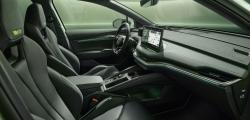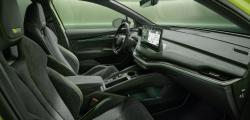 La interior, Skoda oferă două configurații tematice: RS Lounge, cu tapițerie din piele ecologică și microfibră Suedia cu cusături Lime, și RS Suite, care include piele naturală, piele ecologică și cusături gri. Decorurile cu aspect de fibră de carbon completează ambianța sportivă.