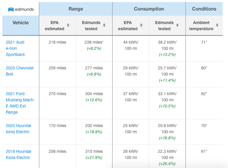 Specialiștii companiei Edmunds.com au efectuat o serie de teste pentru a afla valoarea reală a autonomiei pe care o pot asigura modelele electrice comercializate pe piața din SUA. Majoritatea EV-urilor au parcurs cu un plin de baterie chiar și mai mult decât anunța constructorul. Totodată au trezit discuții rezultatele obșinute de Tesla Model S, Model 3, Model X și Model Y.
