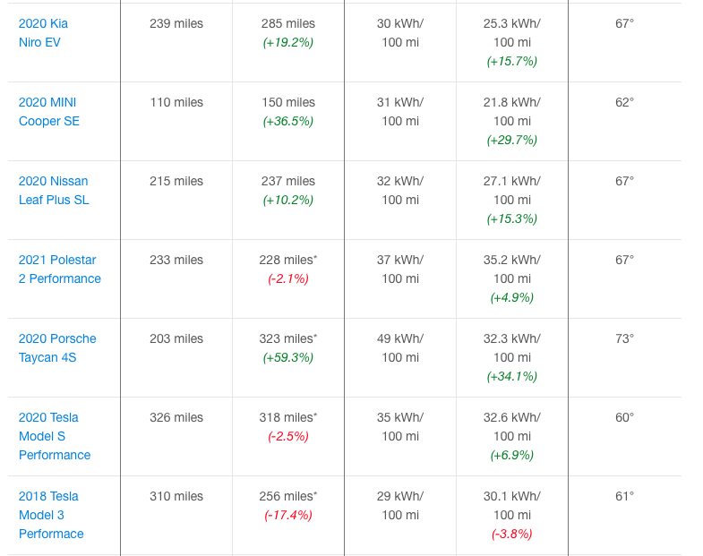 Cel mai bun rezultat a fost obținut de Porsche Taycan 4S, care a fost condus pe o distanță de 520 km, sau cu 59.3% mai mult decât este declarat de producător, 327 km conform ciclului EPA. Un alt rezultat surprinzător a fost obținut de Mini Cooper SE, care a parcurs 241 km față de cei 177 km indicați în actele oficiale. Tot aici menționăm Hyundai Kona Electric cu 507 km în loc de 415km, dar și Kia Niro EV cu 459 kilometri în loc de 385 km declarați de producător.
