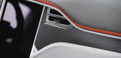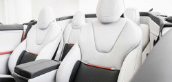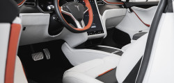Interiorul se prezintă într-o combinație armonioasă de alb, oranj și gri, cu elemente din piele care au fost cusute manual. Cizelările însă nu se opresc aici. Atelierul s-a jucat, de asemenea cu partea din față a Model S. O nouă bară de protecție frontală îi conferă un aspect mai tineresc.