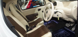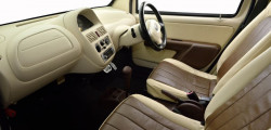 A face interiorul lui Suzuki Twin să arate mai luxos fără modificări radicale nu este o sarcină ușoară, dar totuși nu e imposibil. A fost suficient ca toate panourile din plastic să fie finisate în culoarea bej, iar scaunele și fețele ușilor să fie retapițate cu piele naturală de culoarea crem și maro.