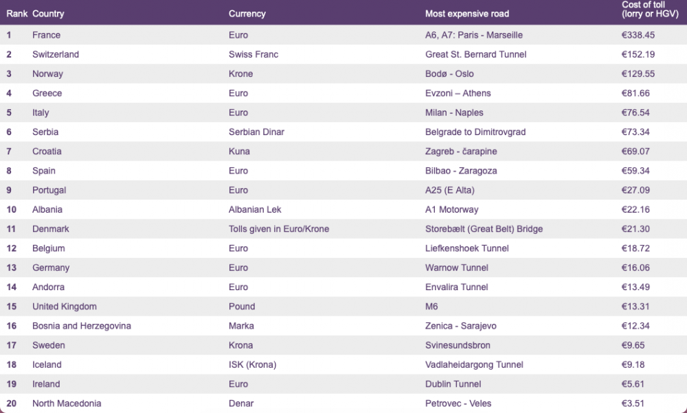 Top zece este completat de țări precum Spania, Grecia, Croația, Elveția, Belarus, Polonia și Rusia, unde taxele de drum variază aici între 32.72 și 17.92 euro pentru anumite rute.