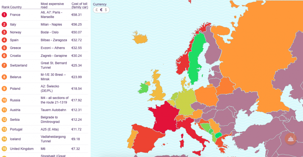 Atunci când planifici o tură prin Europa, pe lângă cheltuielile de combustibil și cazare, trebuie să faci o socoteală care implică taxele pentru drumurile cu plată. Astfel, Franța se clasează pe prima poziție, în topul celor mai scumpe taxe de drum. Pentru ruta Paris - Marsilia, care numără 775 de kilometri, șoferii trebuie să plătească în total 58.31 euro, dacă folosesc autostrăzile A6 și A7. Așadar, o călătorie dus-întors costă peste 100 de euro.