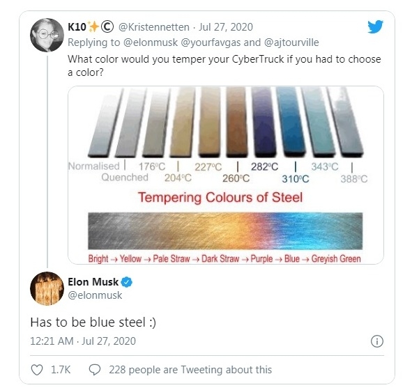 Ei bine, în dependență de temperatura la care se expune caroseria de oțel în timpul operației de călire, se pot obține nuanțe de gri închis, galben,oranj, mov, verde sau chiar albastru. Dintr-o conversație pe Twitter, rezultă că favorita lui Musk ar fi o nuanță de albastru. Mai mult, una din opțiuni ar permite realizarea unor desene pe suprafața exterioară cu ajutorul laserului.