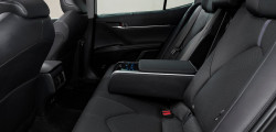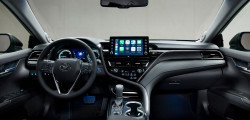 La capitolul interior, Camry Hybrid facelift se laudă cu un display repoziționat de 9 inch, care proiectează sistemul de infotainment, ce acum oferă o reacție mai rapidă la comenzi și devine compatibil cu Apple CarPlay și Android Auto. Clienții vor putea bifa o tapițerie din piele neagră sau bej, iar accesoriile de interior vor fi oferite în două variante: Black Engineered Wood sau Titanium Line Pattern.