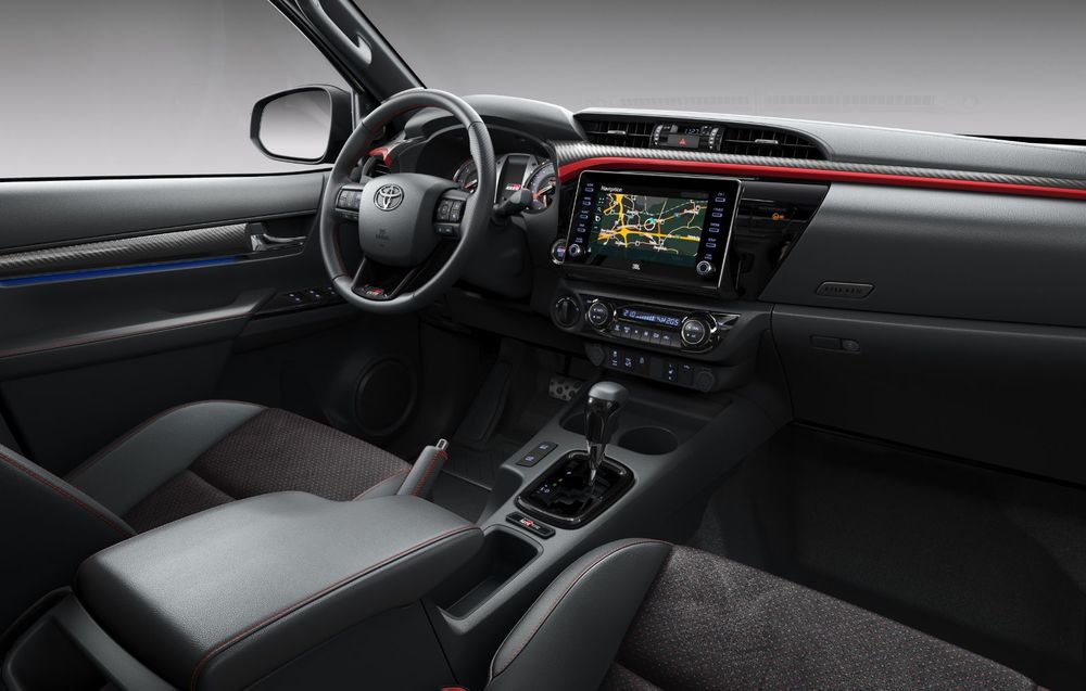 Ce ține de aspect, noua Toyota Hilux GR Sport propune o grilă frontală neagră, care integrează numele companiei, elemente negre pentru caroserie, embleme GR Sport și jante cu diametrul de 17 inch. Farurile LED sunt standard.