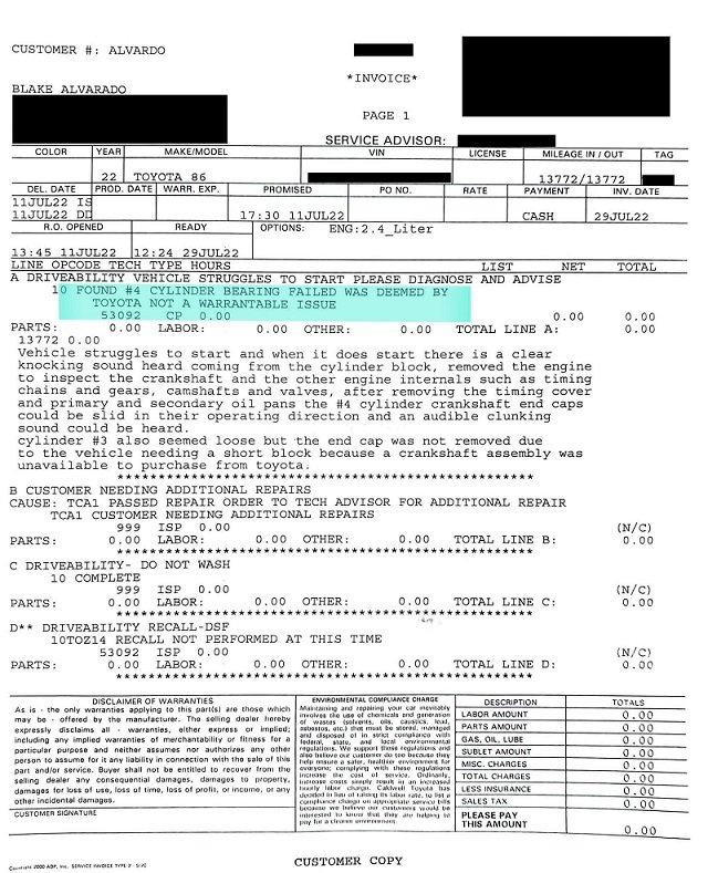Proprietarul unei Toyota GR86 pe nume Blake Alvarado a publicat o postare detaliată pe Facebook documentând povestea care i s-a întâmplat cu sportcarul său. La numai 13.770 de mile parcurs înregistrat pe bord, un rulment al motorului a cedat. Potrivit bărbatului, motorul a dus lipsă de ulei din cauza excesului de etanșant care a căzut în baia de ulei și, în cele din urmă, a blocat țeava de preluare a uleiului.