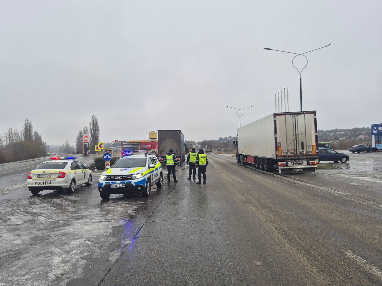 Circulația a fost blocată pe traseul Fetești-Edineț, traseul M-3, direcția de deplasare spre satul Răzeni, raionul Ialoveni, pe traseul M-1, tronsonul dintre localitățile Pănășești și Căpriana, traseul M-5, perimetrul intersecției Negrești-Greblești, traseul R 26, Bender - Căușeni - Cimișlia, în raionul Ialoveni, localitățile Puhoi și Gangura, la ieșirea din Șireți spre șoseaua M-5, traseul R-30, Anenii Noi - Căușeni - Ștefan Vodă.