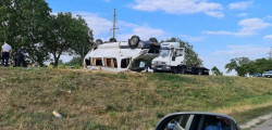 Microbuzul s-a răsturnat în urma ciocnirii, iar un alt automobil de marcă Kia, în care se aflau două persoane, șoferul de 58 ani și pasagerul, a fost proiectată în afara carosabilului.