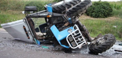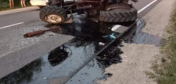 Un tractor a fost inversat după ce a fost lovit violent de o mașină la volanul căreia se afla un polițist!