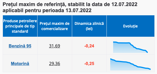 Așadar, potrivit Agenției, benzina se ieftinește cu 24 de bani și ajunge să coste nu mai mult decât 31.69 lei, în timp ce motorina se ieftinește cu 25 de bani și se va comercializa nu mai scump de 29.36 lei!