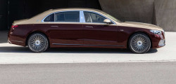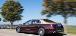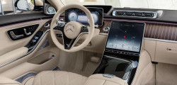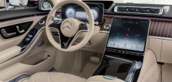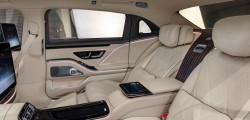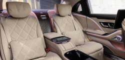 Pe lista de opționale menționăm un sistem audio Burmester 4D, ecrane de 11.6 inch pentru pasagerii din spate și o tabletă pentru a interacționa cu sistemul multimedia MBUX. Opțional, limuzina poate fi echipată cu un frigider montat între scaunele spate, dar și cu pahare de șampanie placate cu argint.