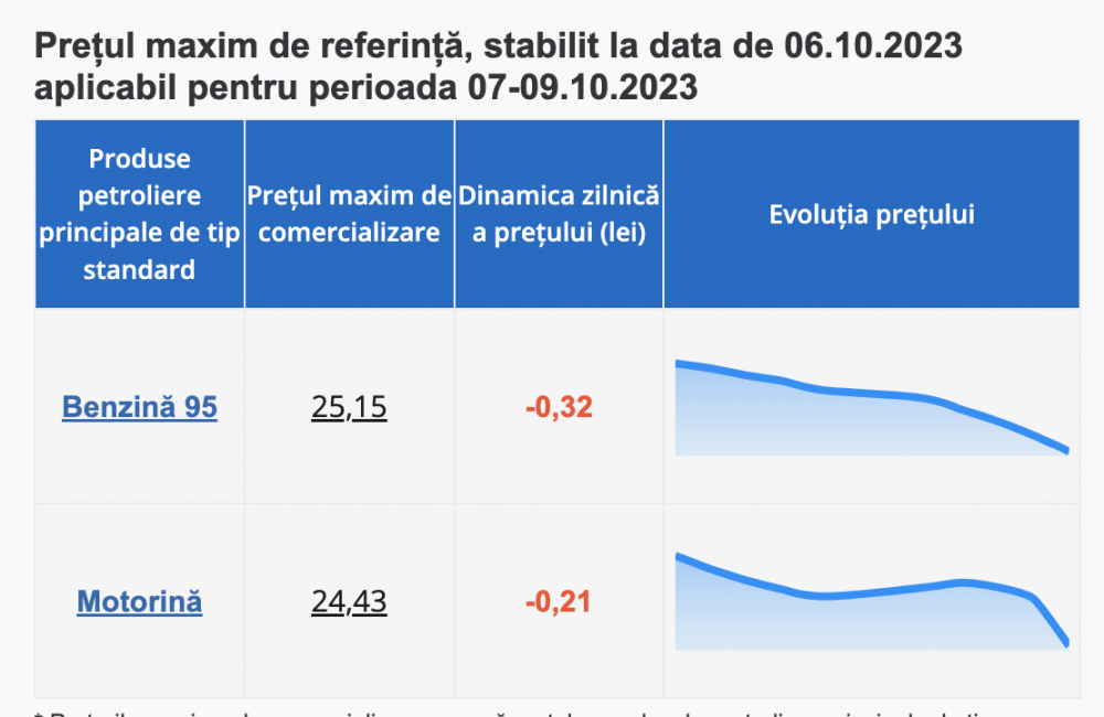 Între timp, un litru de motorină se va vinde la pompă contra unei sume de 24.43 lei, după ce prețul a scăzut cu 21 de bani.