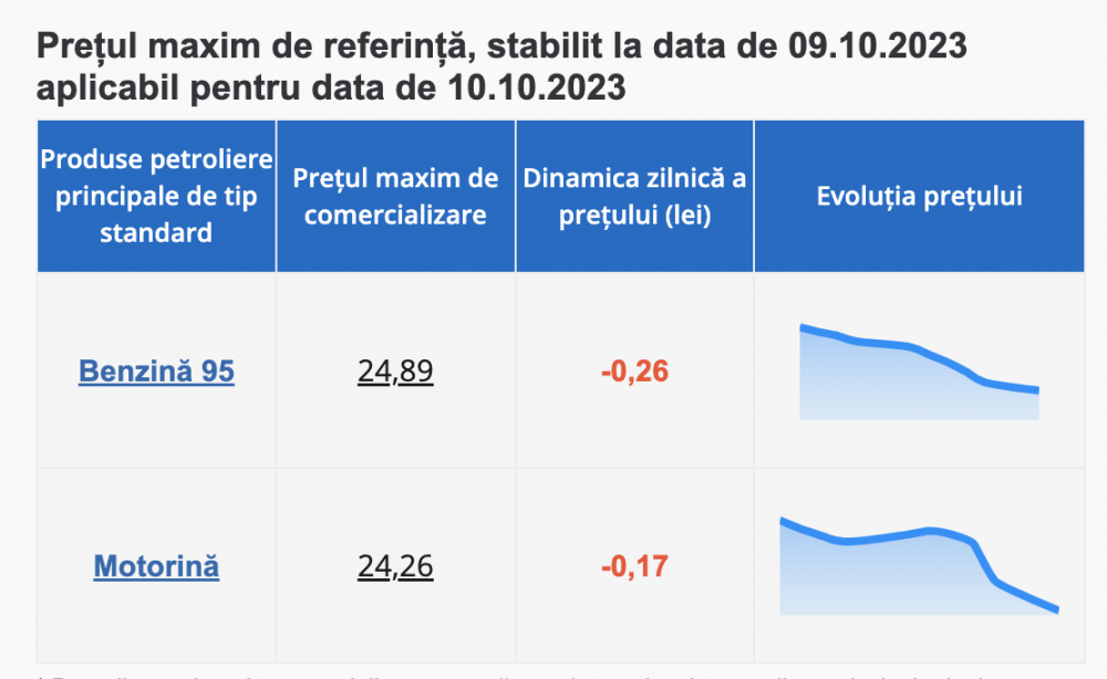Mâine, 10 octombrie, un litru de benzină se va comercializa pentru un preț maxim de 24.89 lei, după o scădere de 26 de bani. Între timp, motorina va fi comercializată la pompă cu prețul de 24.26 lei, înregistrând o scădere cu 17 bani.