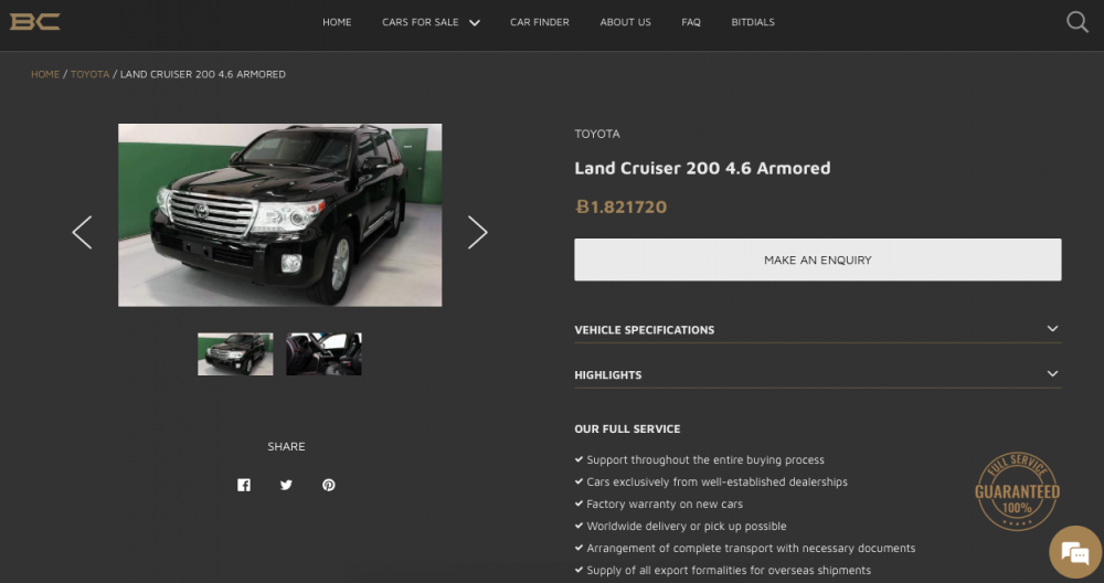 Dacă tot am spus de Toyota, specificăm că pe site-ul Bitcars.eu îți poți achiziționa un Land Cruiser 200 blindat la prețul de 1.821720 bitcoini. Acesta este echipat cu un motor de 4.6 litri volum care dezvoltă 305 CP și poate fi livrat de companie în orice colț al lumii!