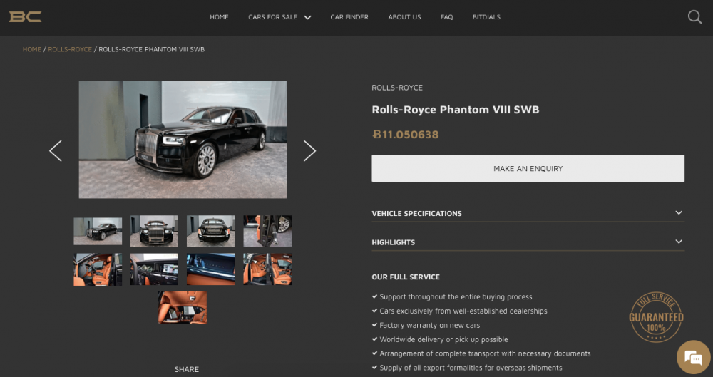 Dacă te poți lăuda cu câteva milioane de dolari în bitcoini cu siguranță ai nevoie de o mașină pe măsură. Cel mai scump Rolls-Royce disponibil în acest moment pe platforma sus menționată este un Phantom VIII SWB care îți va oferi luxul suprem și admirația celor din jur la preț de puțin peste 11 bitcoini.