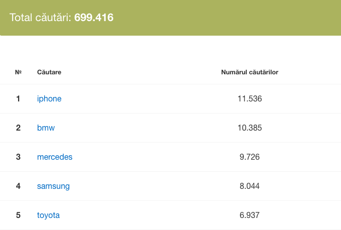 Până una alta, aflați că timp de numai 7 zile, sintagma iphone, din cele aproximativ 700.000 de căutări, în locul de frunte este iphone-ul, cu 11.536 de accesări! Urmat apoi de BMW, cu 10.385 de căutări și pe locul trei, este Mercedes, cu 9.726 de accesări.