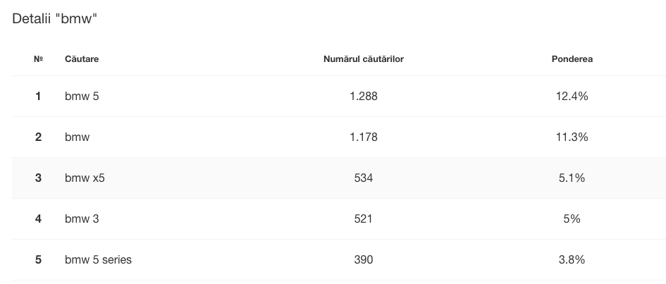 Perioada pentru care sunt afișate rezultatele, este de numai o săptămână, însă va asigur că nu este o diferență foarte mare de la o zi la alta. Cu toate astea, vom publica și un raport mai detaliat cu ”ce caută moldovenii mai mult” sau care sunt de fapt cele mai populare mărci auto selectate în căsuța de căutare al site-ului 999.md.