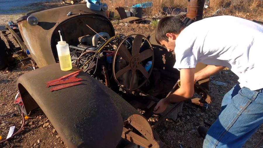 În ciuda vârstei mașinii, uleiul scurs era încă destul de lichid și nu avea amestec de apă. Bujiile au fost scoase fără probleme, după care cilindrii și carterul au fost umpluți cu motorină, iar apoi cu ulei Marvel Mystery și, în final cu lichid de frână.