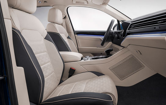 Salonul Touareg-ului, poate fi configurat în funcție de doleanțele clientului, prin trei linii de echipare care schimbă materialele folosite, inserțiile de pe bord și culorile din habitaclu. Acestea sunt Atmosphere cu lemn și culori naturale calde, Elegance dominat de nuanțe și materiale metalice și R-Line care firesc folosește accente sport. Scaunele din față încălzite și ventilate pot fi comandate opțional cu funcție de masaj cu opt moduri de funcționare, care folosește niște perne de aer instalate anatomic sub tapițerie.