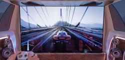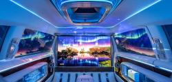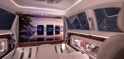 Zona destinată pasagerilor din spate redefinește confortul premium. Aici regăsim un ecran de 65 inch cu rezoluție 4K, retractabil, și un sistem audio Dolby Atmos cu 42 de difuzoare, pentru o experiență auditivă imersivă. În plus, scaunele sunt echipate cu un sistem haptic care oferă vibrații sincronizate cu sunetul redat. Cabina din față este separată printr-un panou de sticlă electrochromatic, care poate deveni opac la apăsarea unui buton.