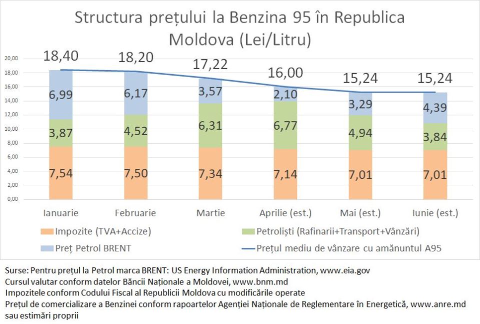 „În luna aprilie, barilul de petrol a atins cota minimă din ultimii 25 de ani, iar recalculat în lei un litru de petrol costa 2,1 lei/litru. În prezent, petrolul costă 4,39 lei/litru. Însă prețul la benzină în această perioadă nu doar că nu a crescut, dar chiar și s-a redus puțin. Noi în calculele noastre operăm cu prețul mediu de comercializare, care este cu 2,5-3,0% mai mic decât prețul la benzinării. Deoarece ANRE publică cu mare întârziere datele de pe piața petrolieră, pentru lunile aprilie-iunie sunt estimările noastre reieșind din evoluția pieței.