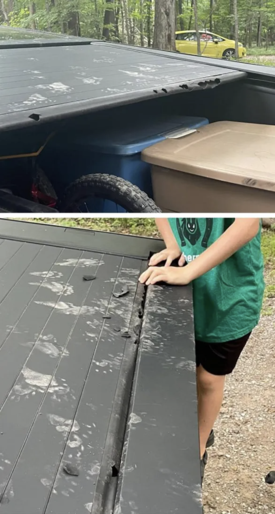 Datorită lăbuțelor și ghearelor mici, ratonii au reușit să smulgă o parte din plăcile de plastic și garniturile de cauciuc de pe ușa portbagajului. De asemenea, mamiferele au lăsat numeroase zgârieturi și urme. În parcarea de lângă camping se aflau și alte mașini, însă ratonii erau interesați în special de Cybertruck.