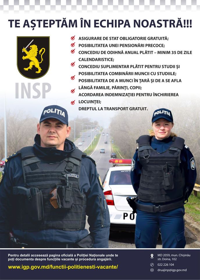 Avem funcții vacante în cadrul Inspectoratului Național de Securitate Publică al IGP.
