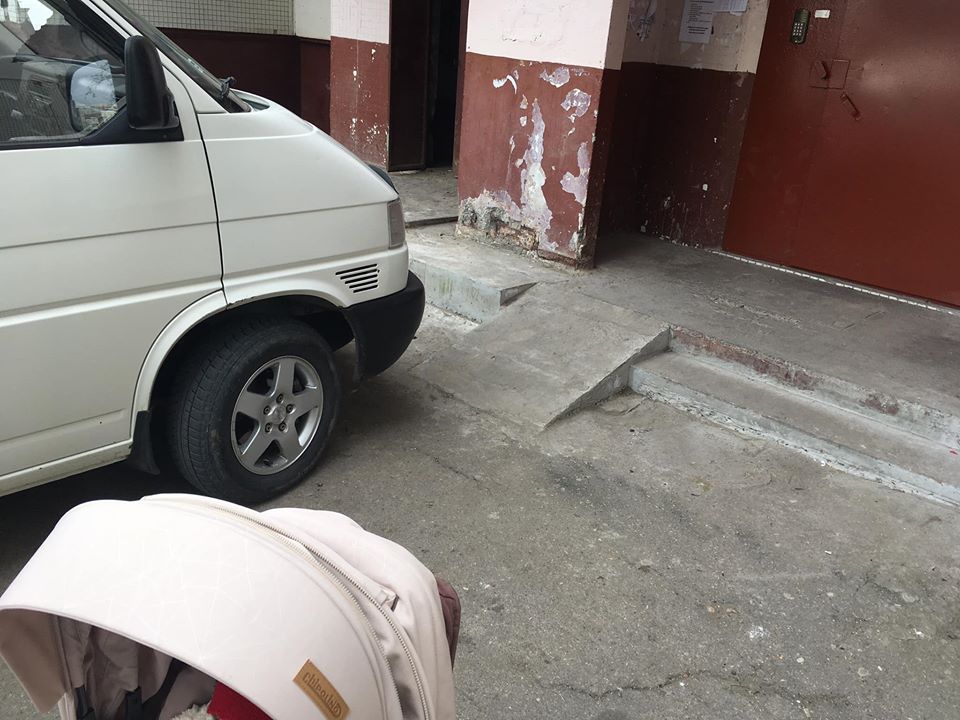 Doamna însă, care nu a putut urca căruciorul în scară, pe panta dedicată, i-a lăsat un mesaj pe parbriz. Un scutec lipit cu bandă adezivă și mesajul propriu-zis ”Data viitoare o să desfac scutecul și îl întind pe parbriz”.